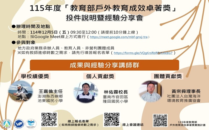 【活動公告】115年度「教育部戶外教育成效卓著獎」投件說明暨經驗分享會